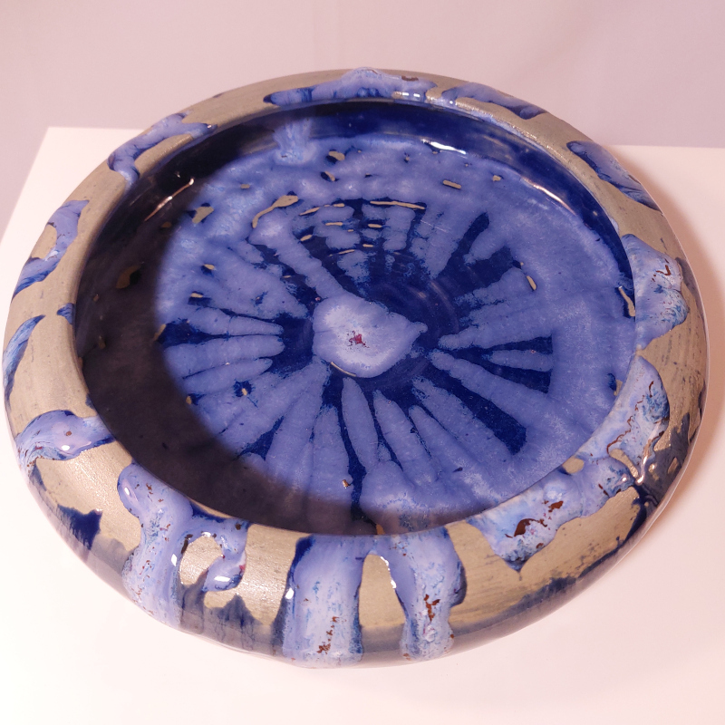 Glasur mit Effektbildner teilweise entnetzt wodurch eine gräuliche raue Oberfläche entsteht.