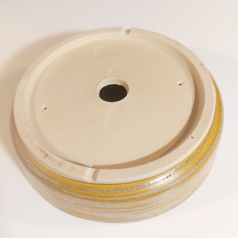 andgemacht, auf Töperscheibe gedreht / rund, mit Wasserablaufloch, Fuß mit seitlichem Wasserauslauf und mit Drahtlöchern.  |