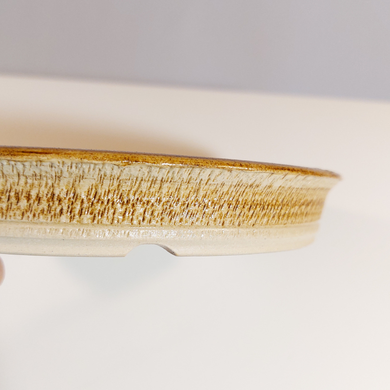 handgemacht, auf Töperscheibe gedreht / rund, mit Wasserablaufloch, Fuß mit seitlichem Wasserauslauf und mit Drahtlöchern. besondere Oberflächenstruktur  |