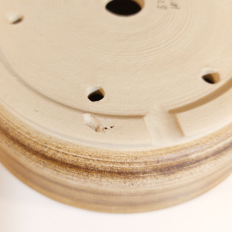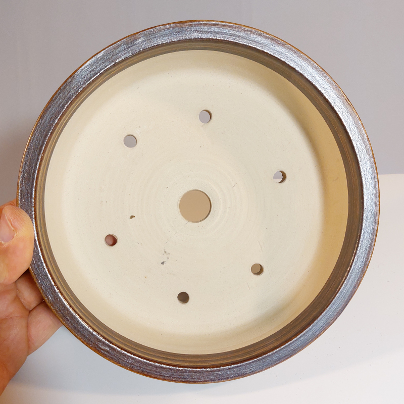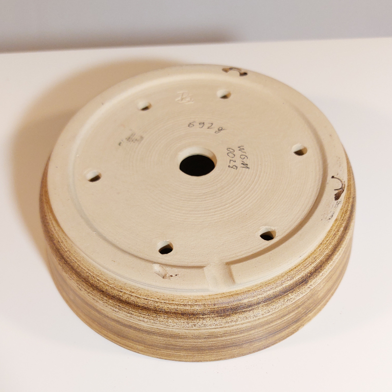 handgemacht, auf Töperscheibe gedreht / rund, mit Wasserablaufloch, Fuß mit seitlichem Wasserauslauf und mit Drahtlöchern.
