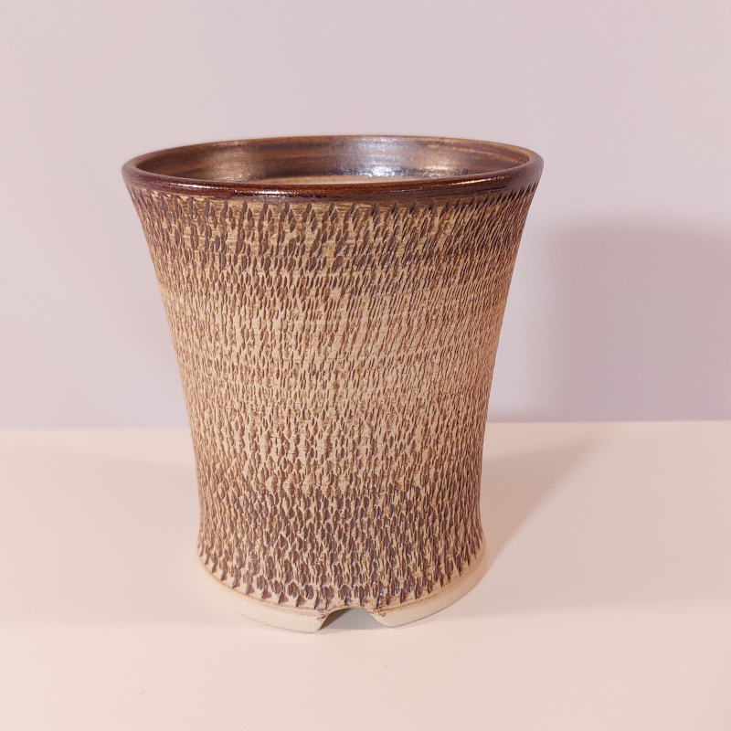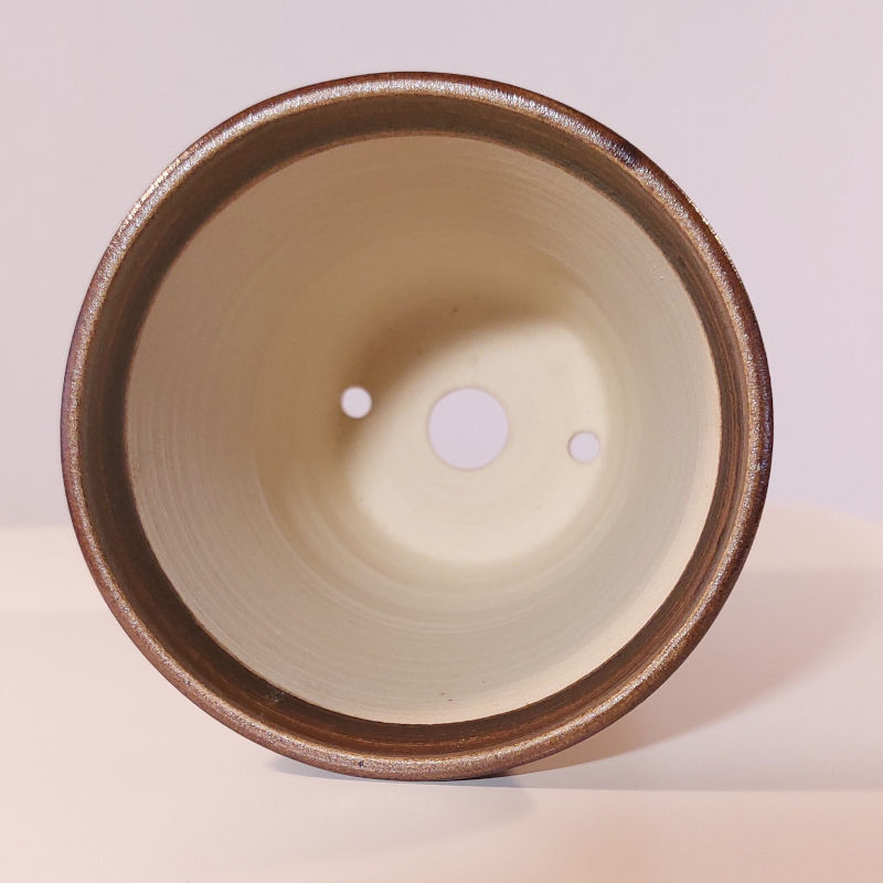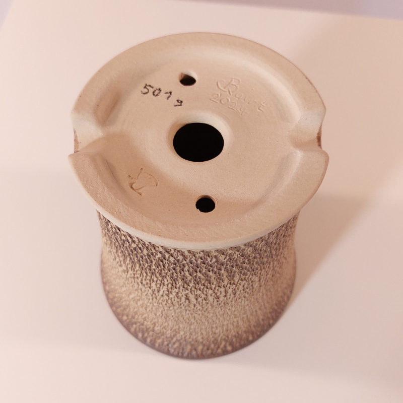 handgemacht, auf Töperscheibe gedreht / rund, mit Wasserablaufloch, Fuß mit seitlichem Wasserauslauf und mit Drahtlöchern.  |