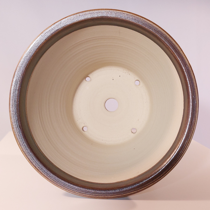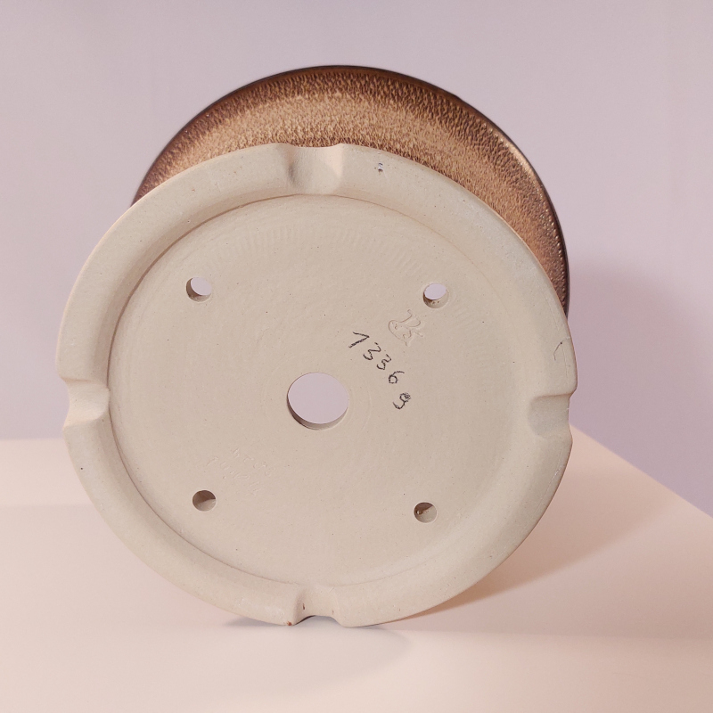 handgemacht, auf Töperscheibe gedreht / rund, mit Wasserablaufloch, Fuß mit seitlichem Wasserauslauf und mit Drahtlöchern.  |