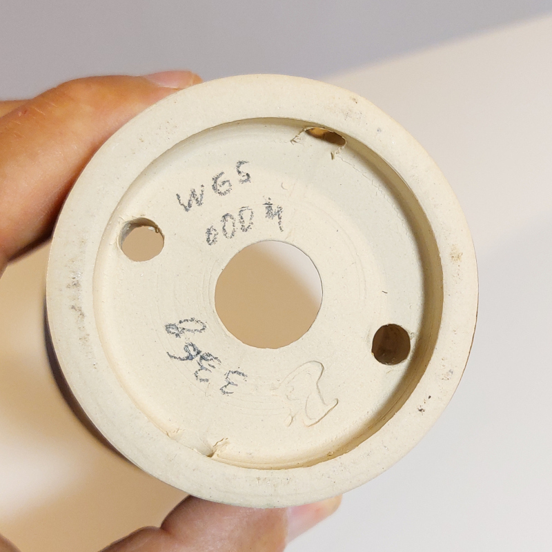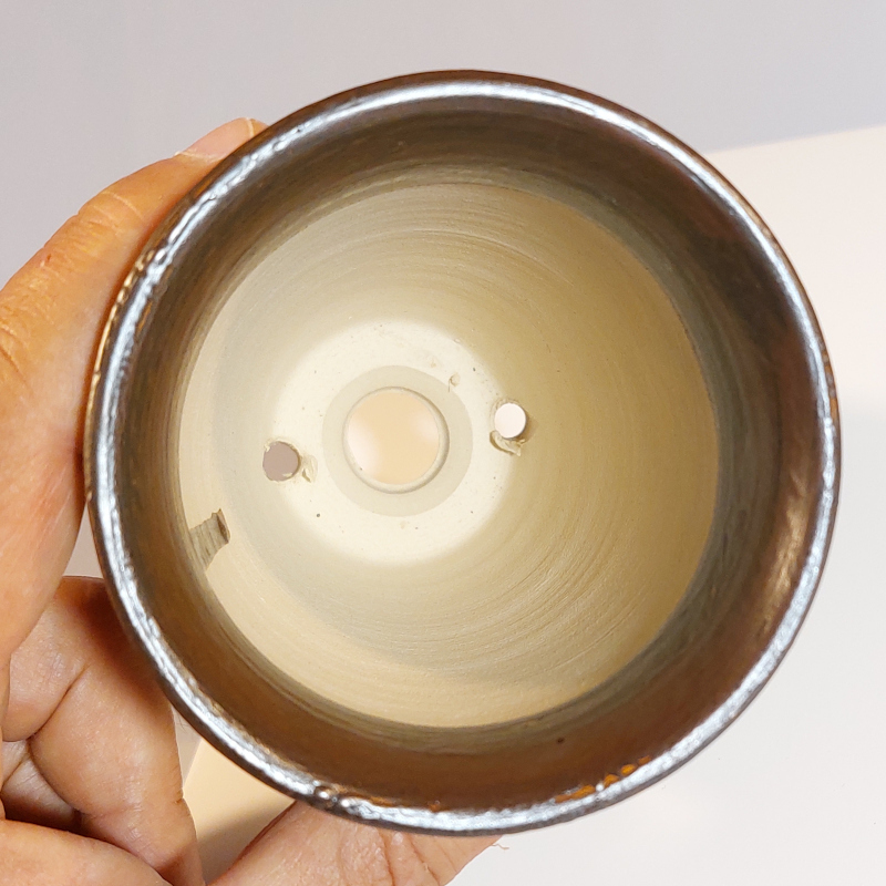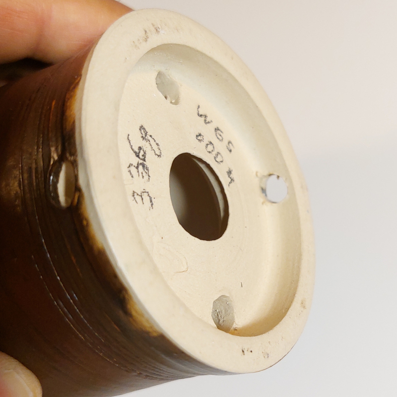 handgemacht, auf Töperscheibe gedreht / rund, mit Wasserablaufloch, Fuß mit seitlichem Wasserauslauf und mit Drahtlöchern.