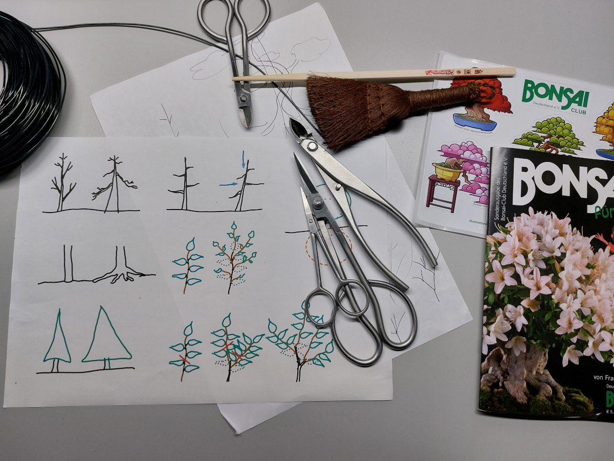 Auch diesesmal haben uns die Kinder überrascht, auch wenn wir besser vorbereitet waren. Wir hatten die Anzahl der Kinder pro Betreuer auf zwei begrenzt und erst bei älteren Kindern bis zu vier Personen pro Gruppe eingeteilt. Meine kleine Konkavschere, die ich mit noch wärend der Triennale zugelegt hatte kam häufig zum Einsatz. Wir hatten Skizzen zur Erklärung genutzt, Jedes Kind konnte ein "Bonsai für Kids" von Frank J. Milalic mitnehmen und wir hatten eine große Auswahl von Rohlingen und Pflanzenarten.