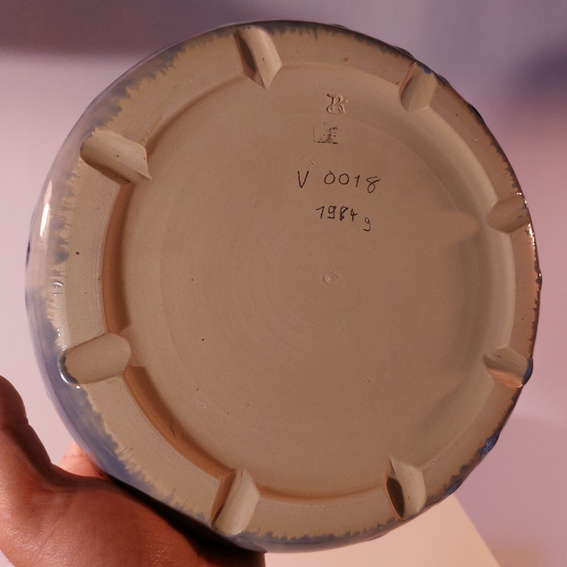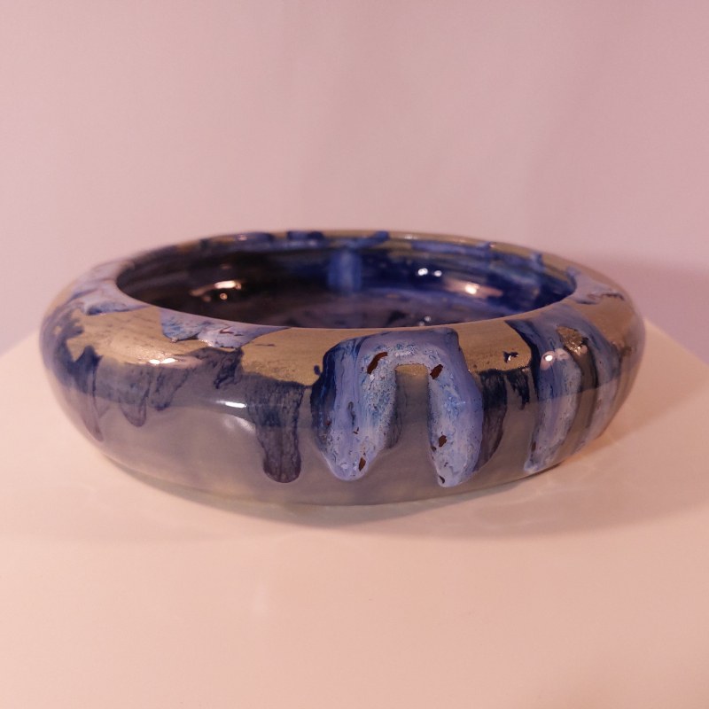 Glasur mit Effektbildner teilweise entnetzt wodurch eine gräuliche raue Oberfläche entsteht.
