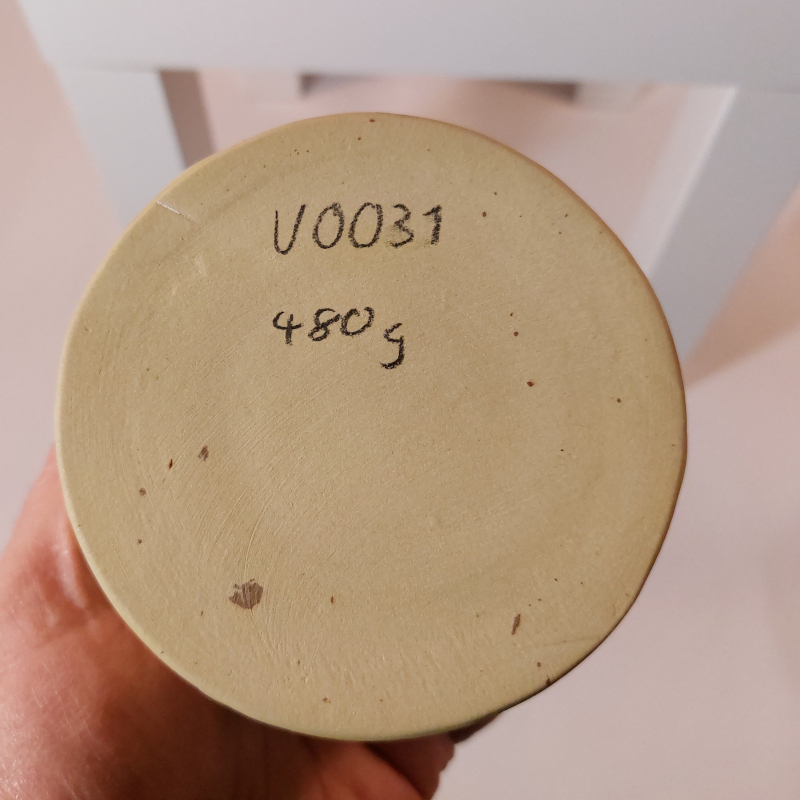 Steckvase aus hellem Steinzeugton mit Dick aufgetragener Sandeffektglasur.