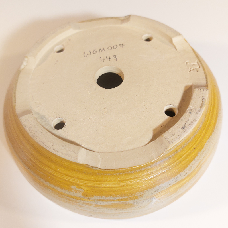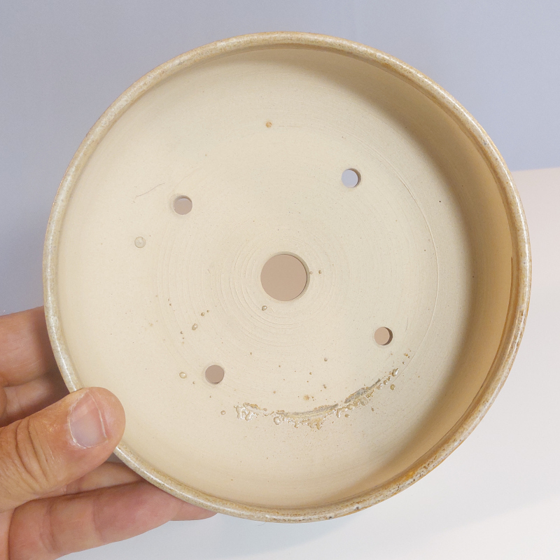 handgemacht, auf Töperscheibe gedreht / rund, mit Wasserablaufloch und Fuß.